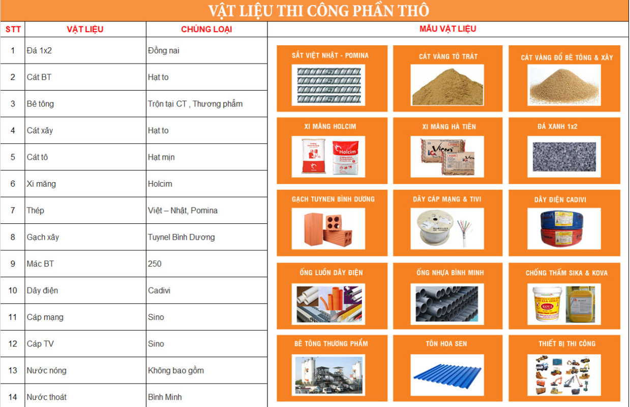 Vật tư xây dựng thô: Thường do đơn vị xây dựng cung cấp (gạch, cát, đá, xi măng, sắt thép).